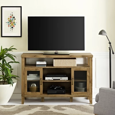Welcome home the Rustic Double Door Buffet by Saracina Home. The symmetrical design features two tempered safety glass doors on each side and one open shelf in the center for a satisfying arrangement of your favorite china, books, or decor. The tall, highboy design’s roomy upper shelf lends an airy touch of added open storage to any coastal living room. This versatile transitional piece looks at home however you use it, whether as a storage console in a home office, a TV stand in the family room, or a buffet in the dining room.