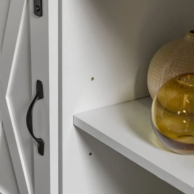Make an on-trend statement in your home with this stylish 52-inch TV stand from Saracina Home. In a modern farmhouse aesthetic, this design style is everything, with barn door inspired cabinets and metal accents. In a multi-functional design, this console can also be used as a storage cabinet in your bedroom or buffet table in your kitchen. The sliding cabinet doors cover up the side or center shelving, with two open shelves above perfect for electronics. Keep your media, books, décor, and more on the adjustable shelving. Made of high-grade MDF, durable laminate, and metal. Can fit up to a 58-inch TV.