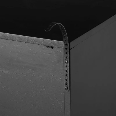 Add functional style in your entryway, living room or other area of your home with the Wood & Cane Console Table with Pull-Down Drawers from Hearth & Handâ„¢ with Magnolia. Crafted from solid wood, this rectangular console table features a clean-lined silhouette in a solid black finish that blends easily with a range of different palettes and decor styles. The cane accented pull-down drawers provide plenty of room for storage, while its bottom shelf offers storage for tucking extra items out of the way. Stage it in the hall or behind the living room sofa with your favorite decorative items, greenery and family photos to bring your personal touch.